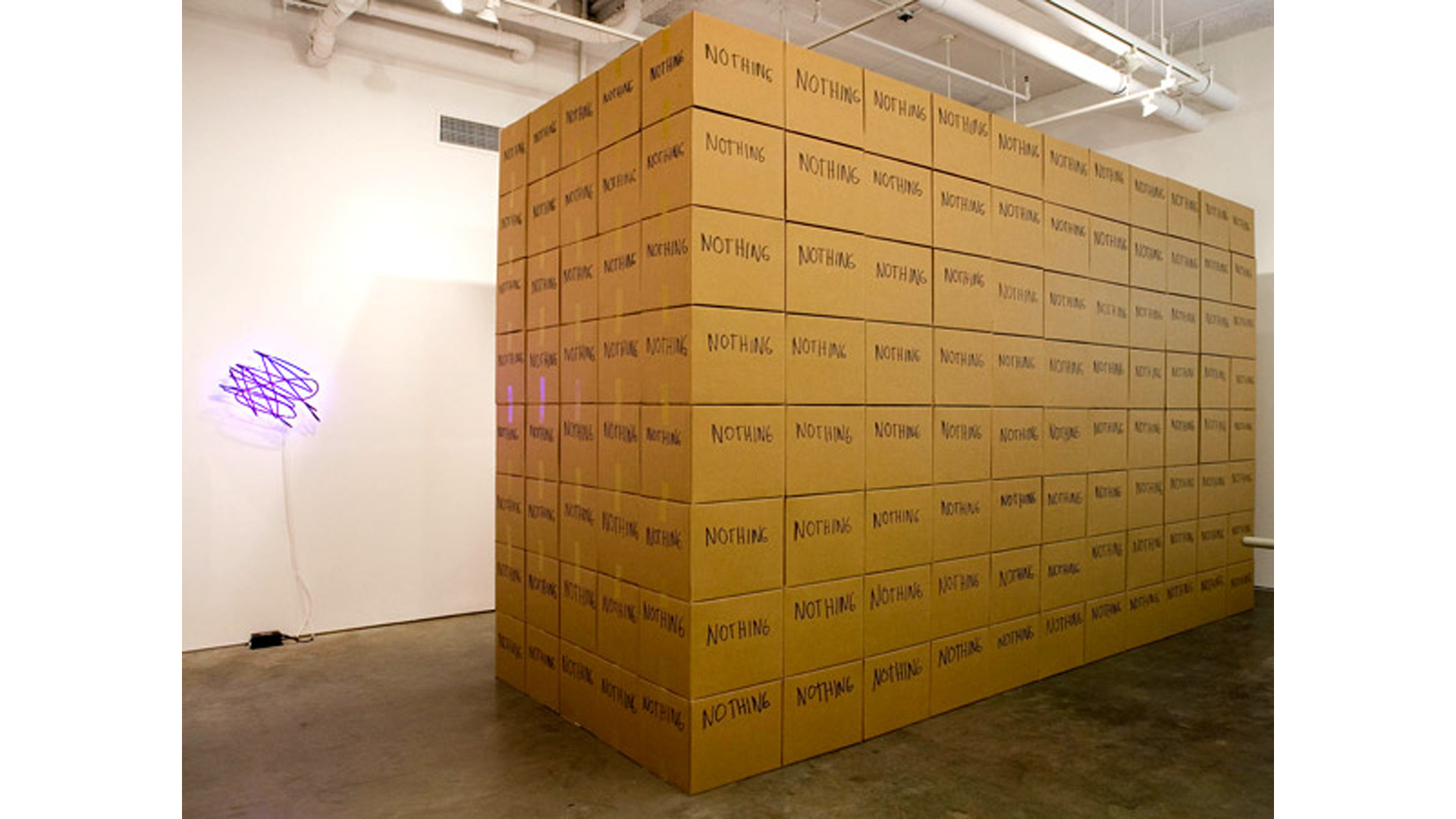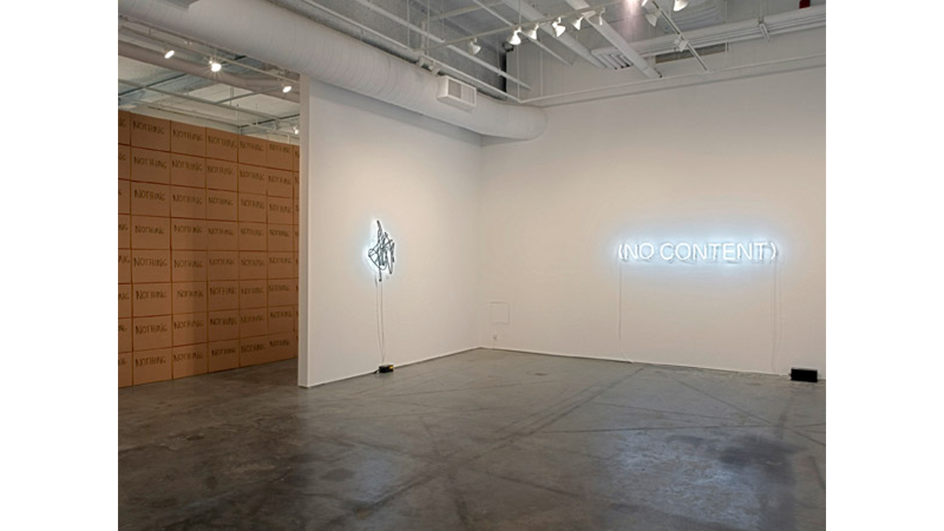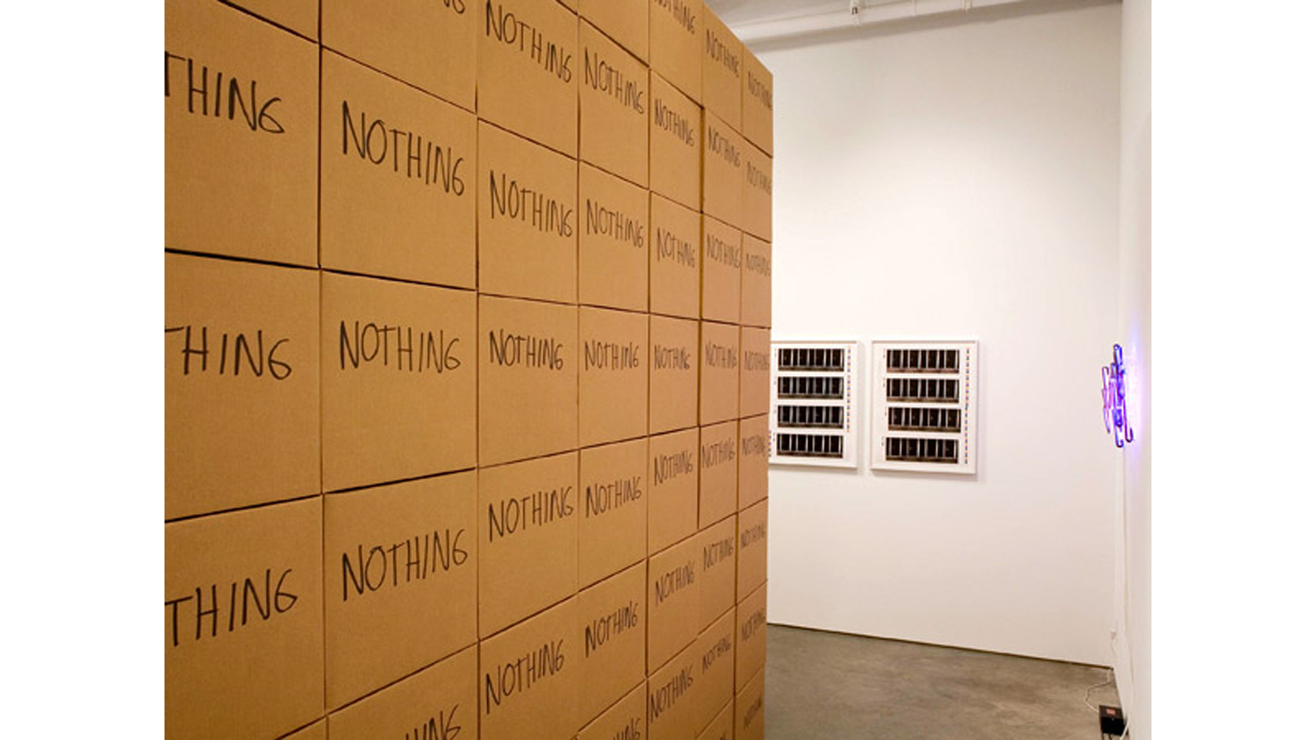 Brüggemann abstracts neons for the first time in a new series Obliteration. The scribbled neon text is a gestural analogy to writing and unwriting. NOTHING, a stack of eponymously inscribed cardboard boxes, explores the idea of the void, or rather, as proposed by the French writer Georges Perec, what surrounds the void; the box then serves as a reminder of a space that is beyond our knowledge and powers of description. The body as a vessel is also not exempt from inquiry in this show. Brüggemann´s OFF, a photographic work, shows a selection of frames depicting the rear view of a woman in black against a black background. Her silhouette seen again and again is repetition subtly traced against the dark scenery and the slightest differences in the subject's movement between the images is at the same time elusive and provocative.
