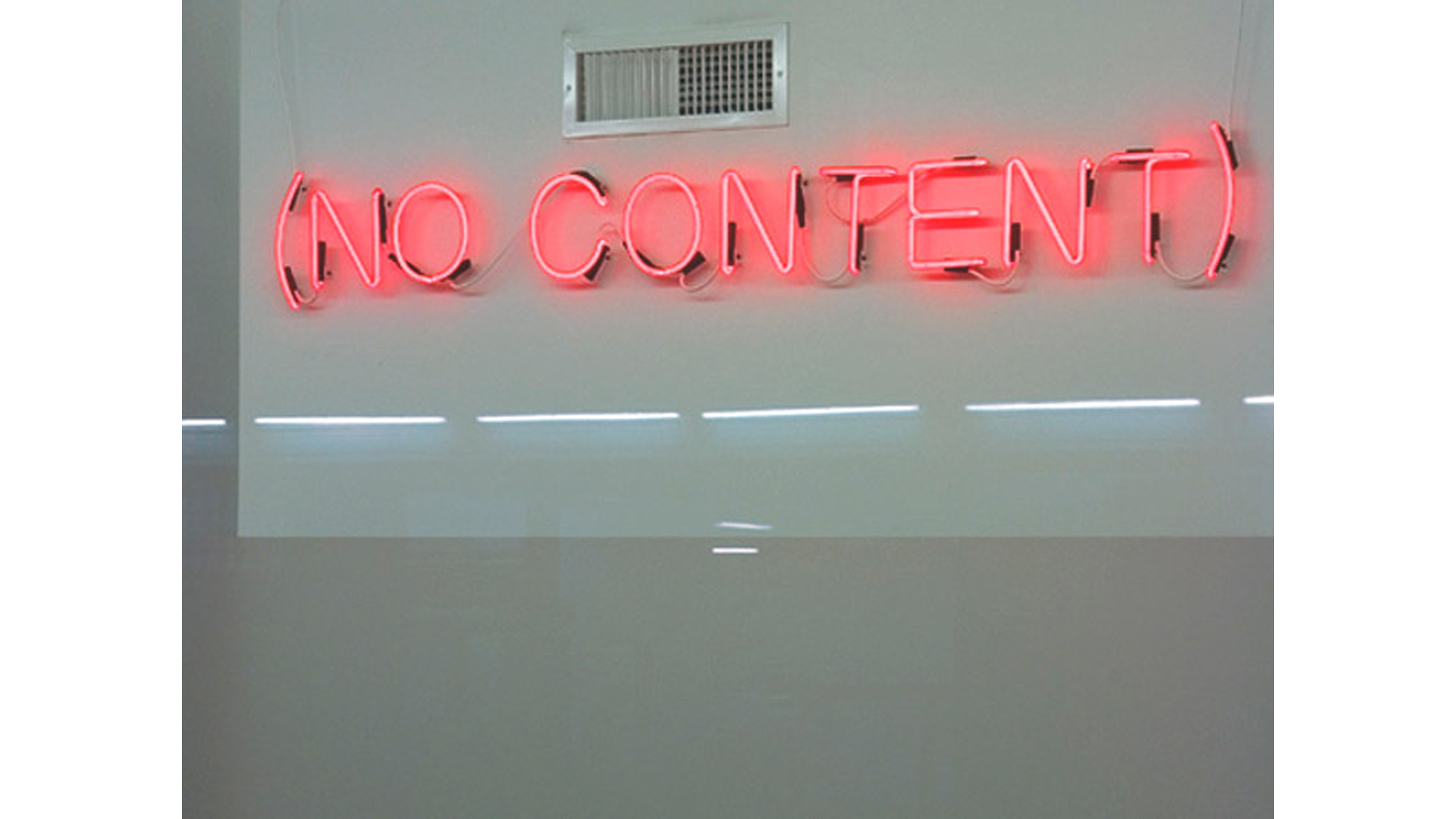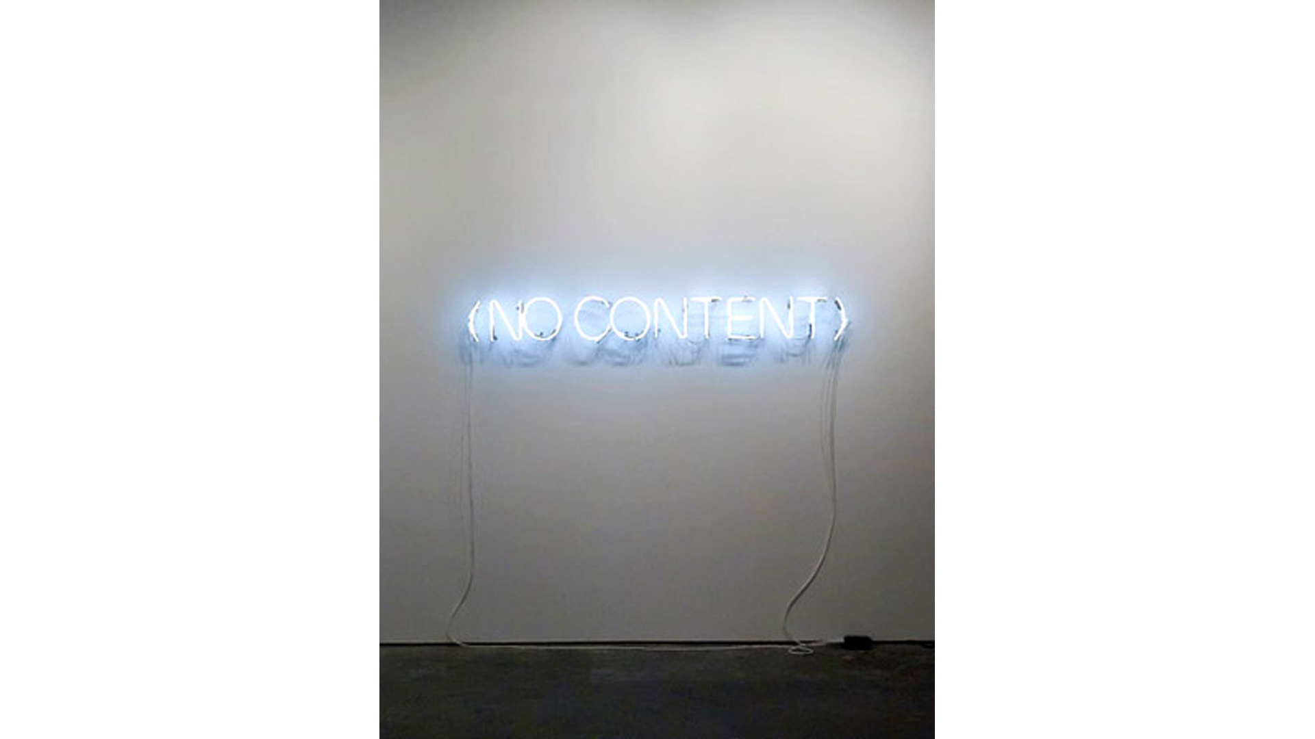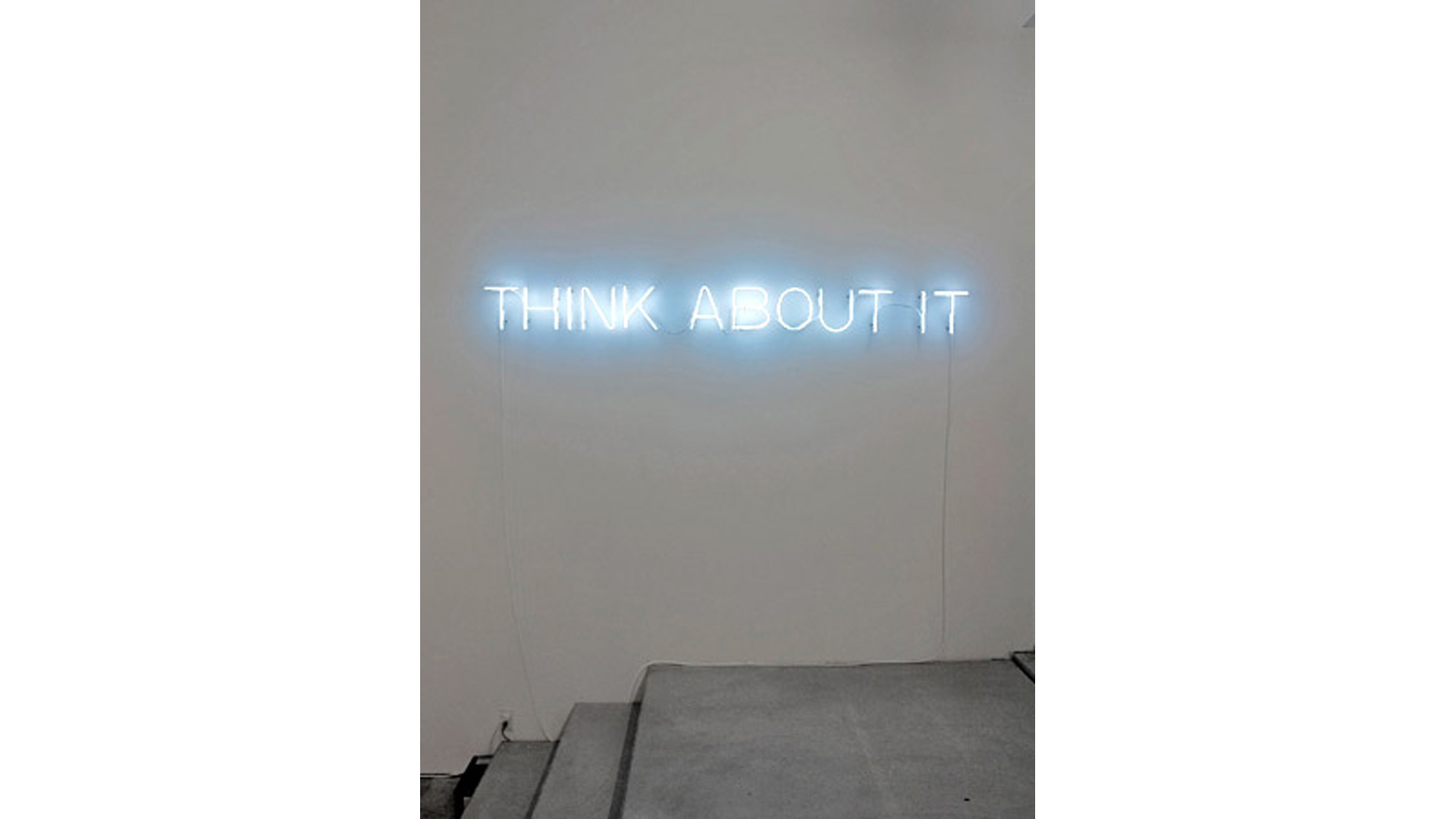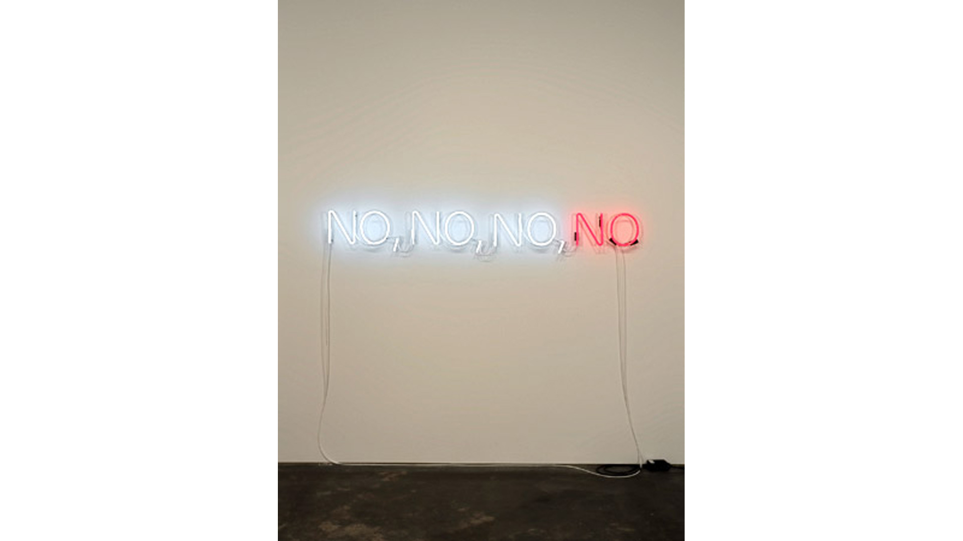 The minimal appearance of Brüggemann´s statements reduces description to a point of no return. In works such as NO, NO, NO, NO there is a concern with reiteration, and the different color of the fourth and final NO compels the work forward. The words are picked out in white neon apart from the final one, spelled out in crimson. The negation thus drives the viewer towards its final utterance, suggesting a change of emphasis or terminal point: the end of nothing. We describe our existence by way of the experiences and things that are remarkable or salient; we celebrate what jars the norm or stands out from the ordinary, whilst ignoring and forgetting all that is commonplace and repetitive. Brüggemann reverses this preference, not by showing us the hidden beauty and pleasure derived from the overlooked, but through his insistence on rendering visible, on giving form to what can only exist as a concept.